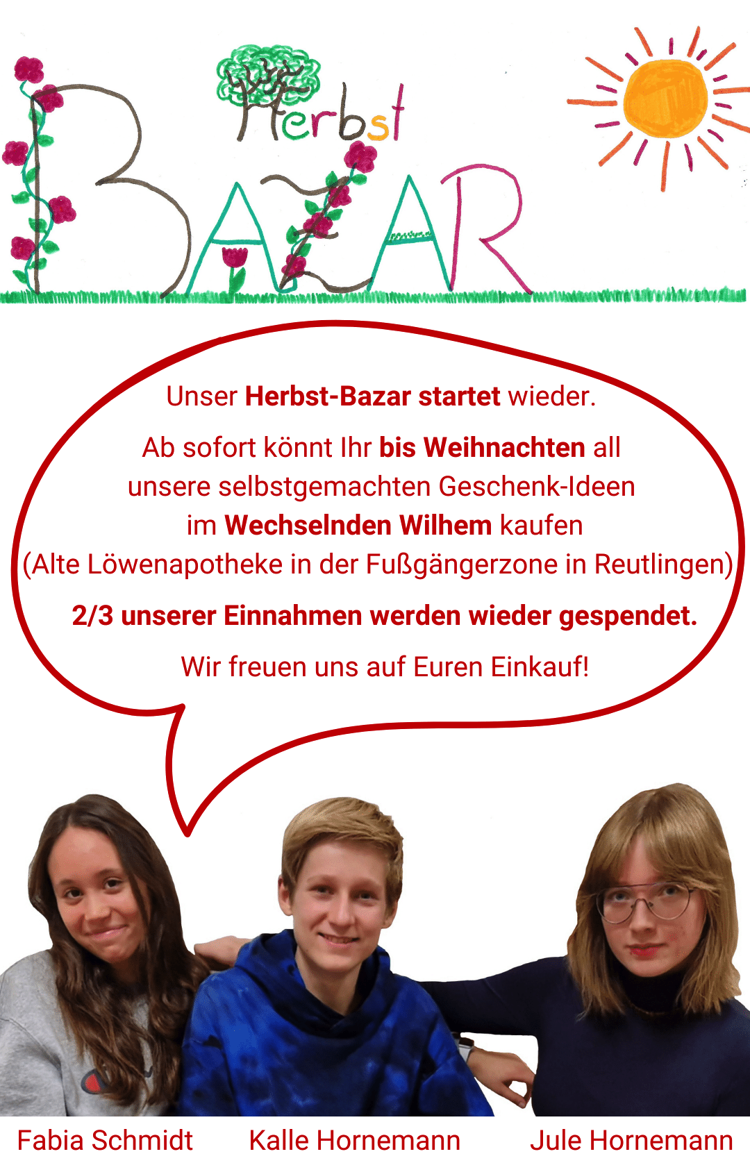 Drei Jugendliche, nämlich Jule, Kalle und Fabia setzen dieses Jahr ihre bereits mehrjährige Tradition mit einen Herbstbazar fort. Seit dem 22.11. haben sie eine kleine Ecke im "Wechselnden Wilhelm" (einem Pop-up Store in der Reutlinger Fußgängerzone, weitere Informationen dazu hier) wo selbstgebastelten Geschenkideen verkauft werden.